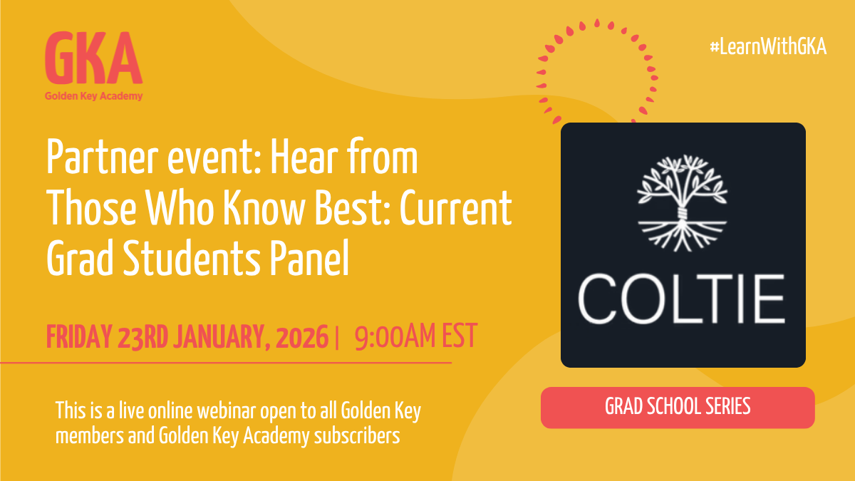 Golden Key Academy is a place of online learning created and run by Golden Key International Honour Society. It offers over 50+ hours of online training videos plus weekly live webinars, special events and access to a library of informative content covering career development, workplace readiness, communication, study skills, personal finance and leadership.