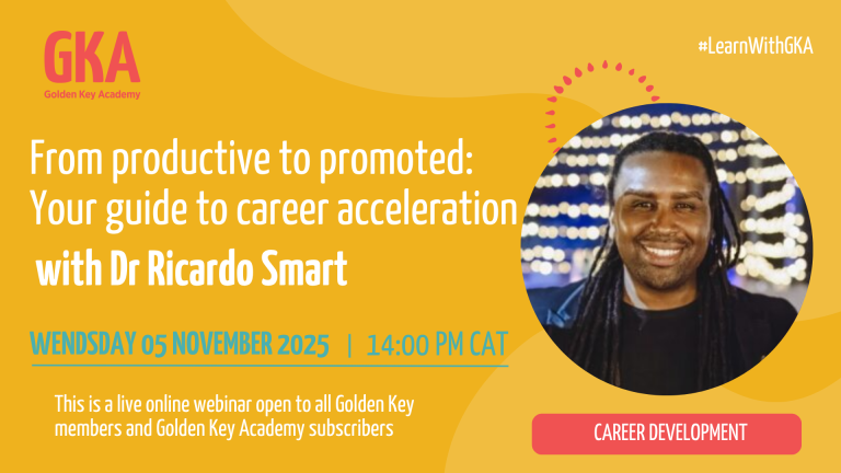 Note: All sessions will be recorded and posted on the Videos page here on Golden Key Academy. Green literacy: How leaders create opportunities for critical thinking, reading, and writing with Jen Cullerton JohnsonTue - Nov 04, 2025Exclusive Service Offering Information Session: Bonile Mqokozo Consulting with Osca MqokozoWed - Nov 05, 2025From productive to promoted: Your guide to career acceleration with Dr Ricardo SmartWed - Nov 05, 2025Golden Key Leadership and Management Summit 2025 (10th-14th November, 2025)Mon - Nov 10, 2025Financial Stewardship with Rudi BouwerWed - Nov 12, 2025Access Plus Keynote: The Upper Hand: Mastering Persuasion and Getting What You Want with the Science of Social Engineering with Dr. Abbie MaroñoThu - Nov 20, 2025Partner event: A Peek Behind the Curtain: Faculty PanelFri - Nov 21, 2025Access Plus Keynote: Make Memory Your Edge in an AI-Driven World with Chester SantosMon - Dec 15, 2025Partner event: Hear from Those Who Know Best: Current Grad Students PanelFri - Jan 23, 2026